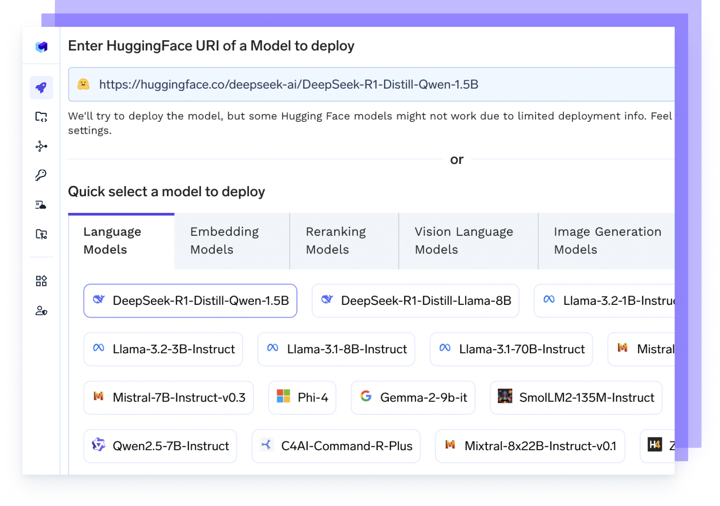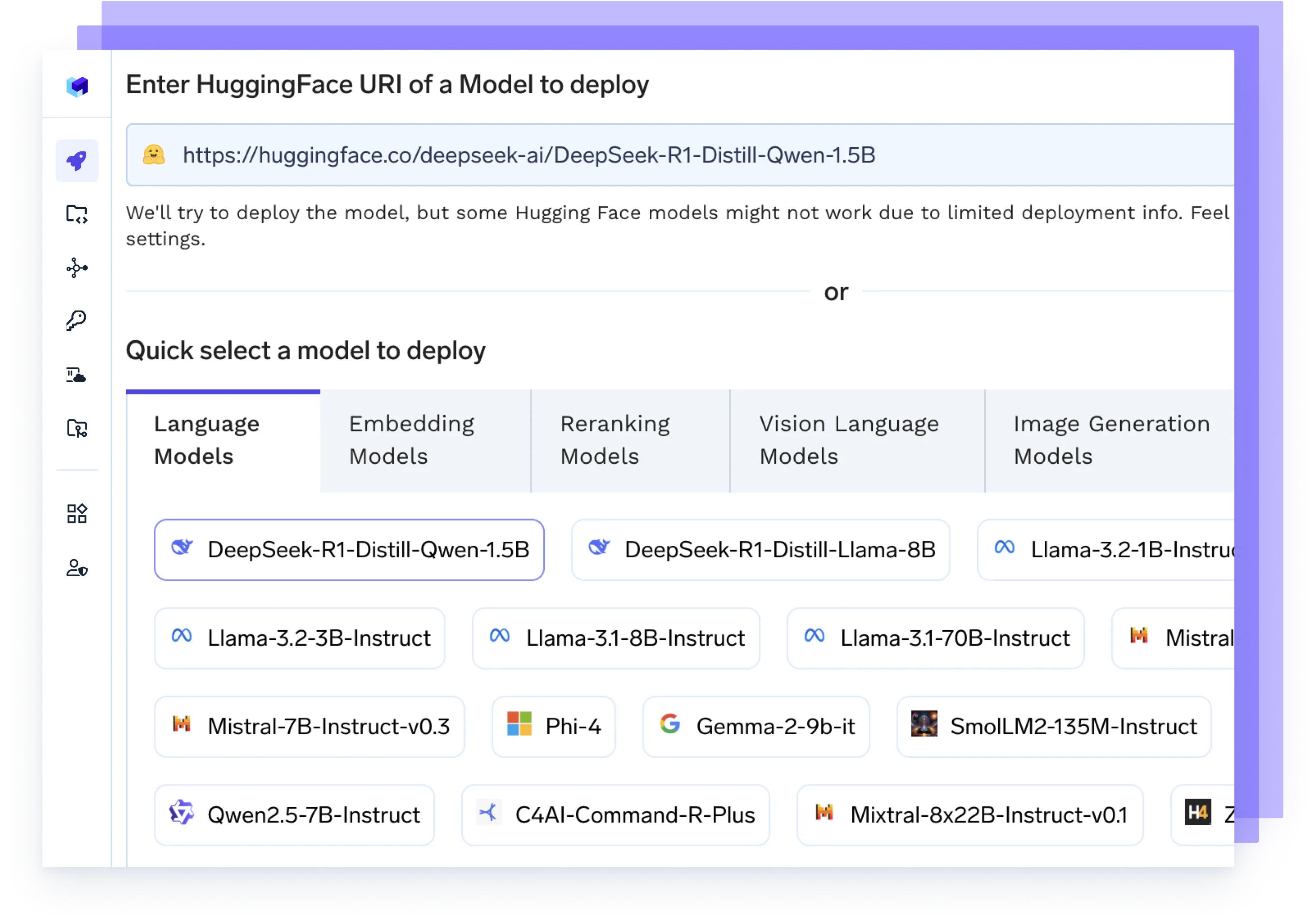 Run any LLM, embedding model, or custom models using high-performance backends like vLLM, TGI, or Triton â optimized for speed and scale.